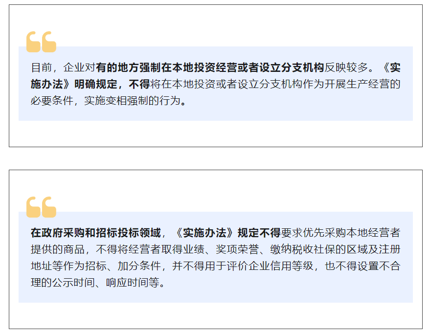 “限定经营者所有制形式、注册地”“强制在本地投资经营或者设立分支机构”……围绕当前不当干预市场竞争的突出表现,市场监管总局18日召开新闻发布会,介绍近日发布的《公平竞争审查条例实施办法》有关情况,针对解决经营主体反映强烈的问题,回应社会关切。