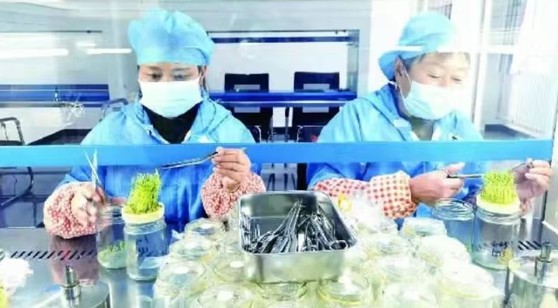 近日,在位于油娄沟镇膳房堡村的张北慧心农业有限公司微型薯种苗育苗室内,工人们手持镊子和剪刀,熟练地将瓶苗剥离,一瓶瓶新苗陆续诞生,而成排的新苗会被放到置物架上,日日观察,精心照料。39岁的杨晓慧是该公司的负责人也是马铃薯产业链上的年轻一代。“我的父母之前都是大田种土豆,目前,我们的组培室是全村规模最大的,繁育有十多个品种,产品远销内蒙古、云南等地。”杨晓慧介绍道。
