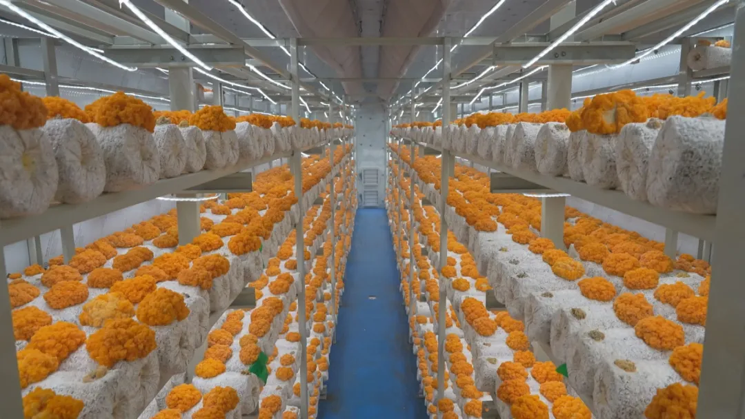 经过精心培育和悉心照料,首批金耳菌试种成功,顺利采摘入库、精装上市。走进食用菌云仓,10个占地约600平方米、配备智能化温控系统的“高科技小屋”整齐排列。每个云仓批次产量约2500公斤,一朵朵色泽金黄、形状饱满的金耳菌,宛如金色的花朵,在云仓中绽放。
