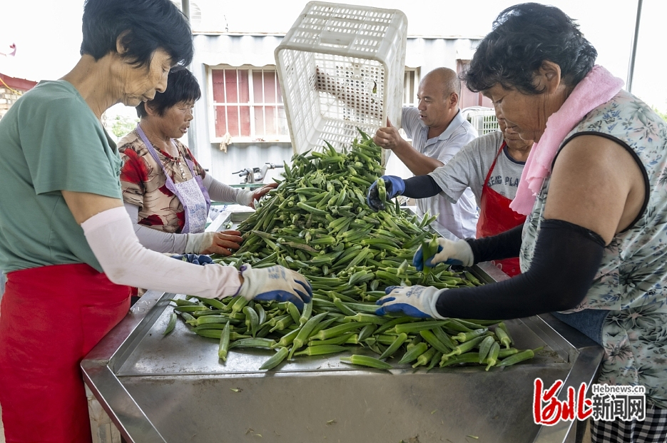 7月15日,农民将采摘的黄秋葵进行分拣。