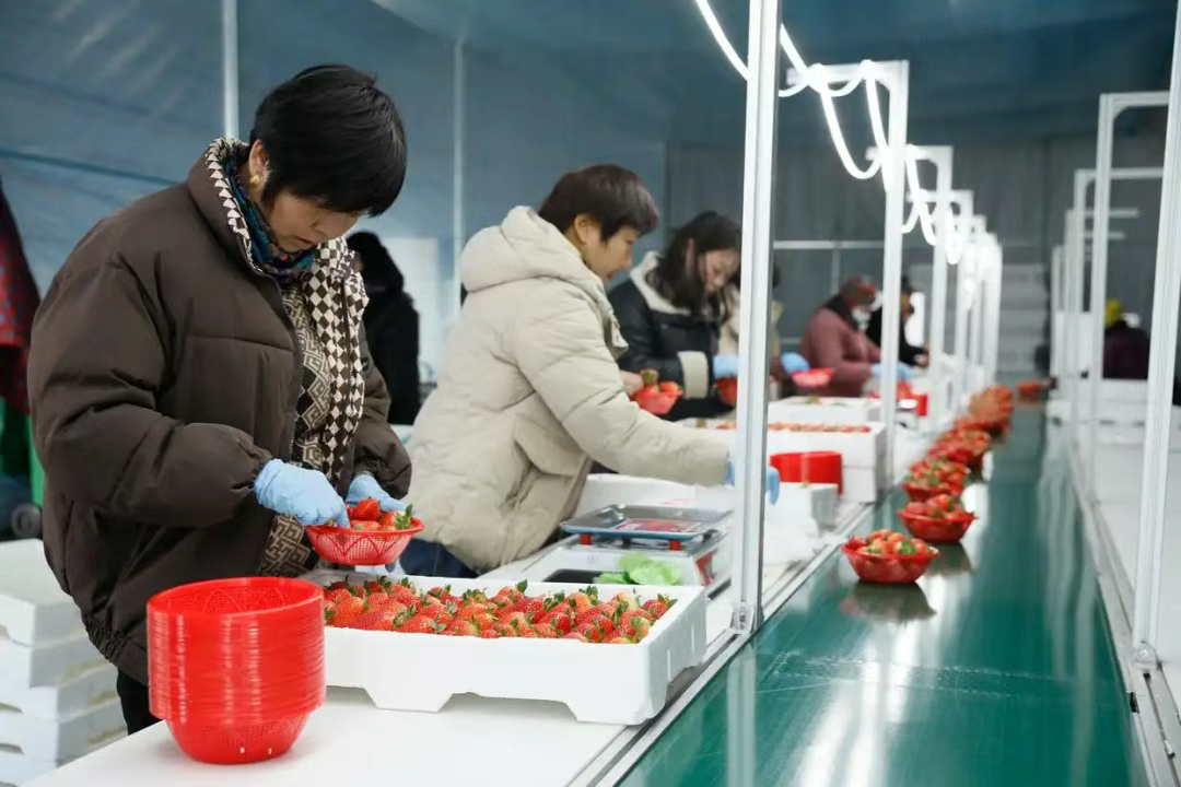 分拣、装箱、打包……在腰山镇才良村沃野草莓现代化农业园区的一处分拣中心,工人们忙着将刚采摘的草莓进行打包,准备发往合作的各大商超。“我种植的4个草莓大棚现在都进入了采摘期,今天红颜99草莓的收购价是28元一斤。”农户高红芳说。