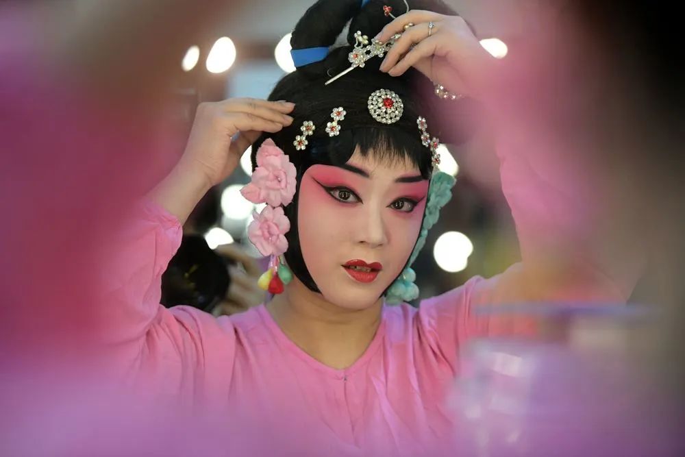 6月6日,在河北石家庄大剧院,石家庄市京剧团演员在化装。