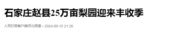 河北石家庄市赵县是中国雪花梨之乡,雪花梨已有2000多年的栽种历史,全县梨果总面积约25万亩,年总产梨果约60万吨,年产值达到30亿元以上,梨果产业带动从业人员达14万余人。