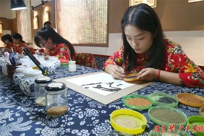 在钻研粮食画的过程中,张海增经历无数次失败。他将大豆、芝麻、黍子等种子分类处理,在木板上反复试验粘、贴、拼、雕等技法。十年磨一剑,张海增终于攻克了技术难关。2010年,他创办海增粮艺公司,立下誓言:“要让粮画活起来,让乡亲们富起来。”