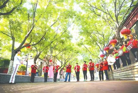 武强县周窝音乐小镇农民西洋乐队街头表演。