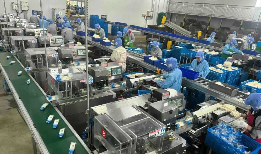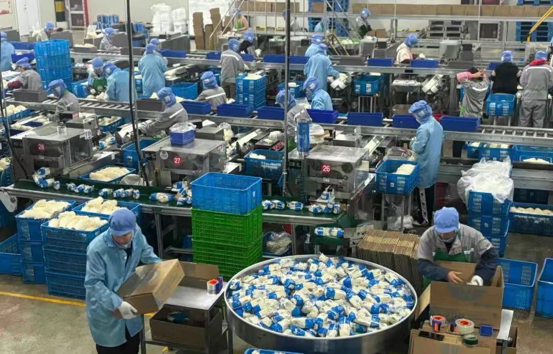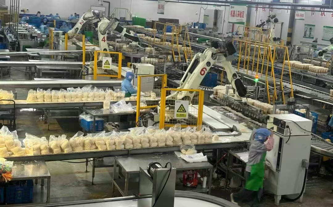 金针菇达到采收标准后,通过自动化流水线进入包装车间,由工人与智能机器人协同完成采收、分拣、包装,再通过冷链物流发往京津冀、东三省、内蒙古、山西等地,走上千家万户的餐桌。