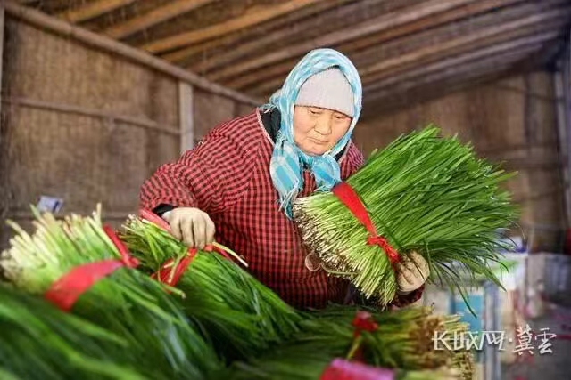农户们正在打捆韭菜。赵江涛 摄