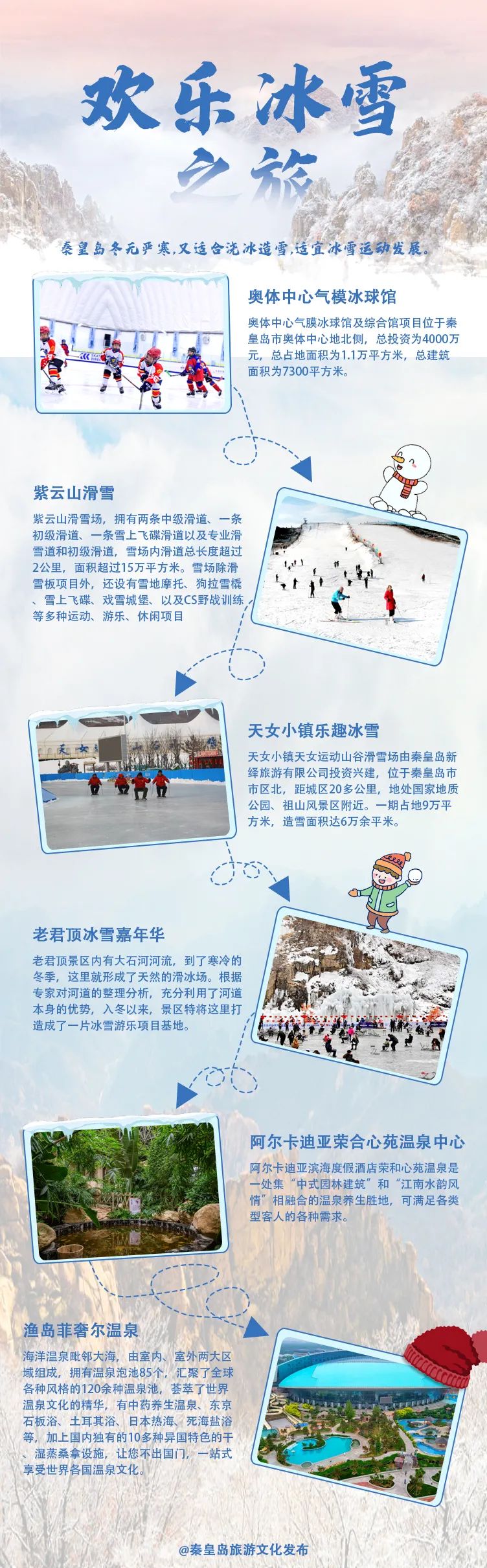 秦皇岛冬无严寒,又适合浇冰造雪,适宜冰雪运动发展。欢乐冰雪之旅包括奥体中心气模冰球馆、紫云山滑雪、天女小镇乐趣冰雪、老君顶冰雪嘉年华、傍水崖冰河世纪、渔岛菲奢尔温泉、阿尔卡迪亚荣合心苑温泉中心。