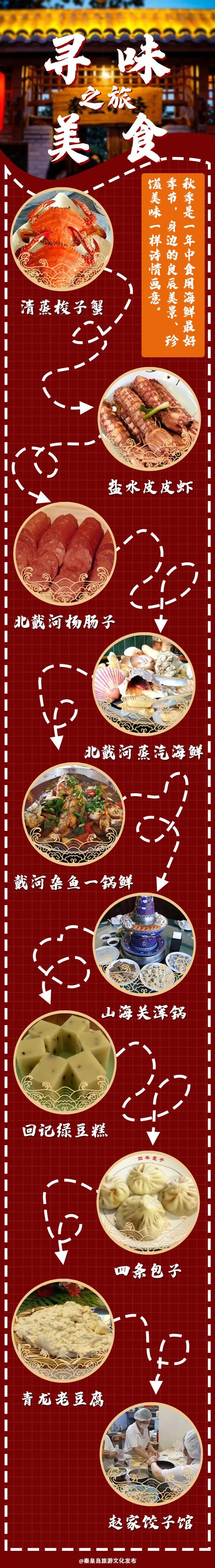 秋冬是一年中海鲜最肥美的时候,寻味美食之旅推荐美食有清蒸梭子蟹、盐水皮皮虾、北戴河杨肠子、戴河杂鱼一锅鲜、山海关浑锅、桲椤叶饼、回记绿豆糕、青龙老豆腐、戚家军八大锅等。