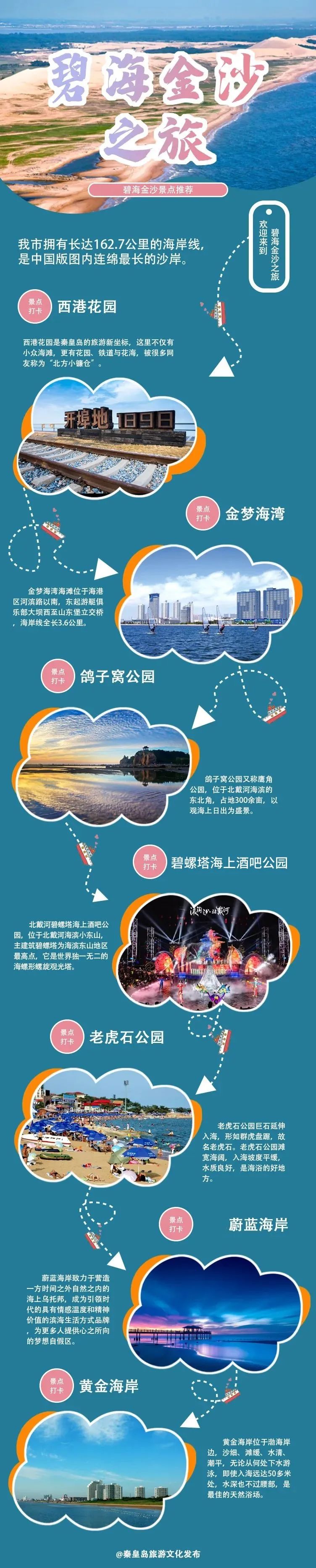 我市拥有长达185公里的海岸线,是中国版图内连绵最长的沙岸。碧海金沙之旅推荐的景区有西港花园、金梦海湾、鸽子窝公园、碧螺塔海上酒吧公园、老虎石公园、阿尔卡迪亚滨海度假区、蔚蓝海岸、黄金海岸风景区等。