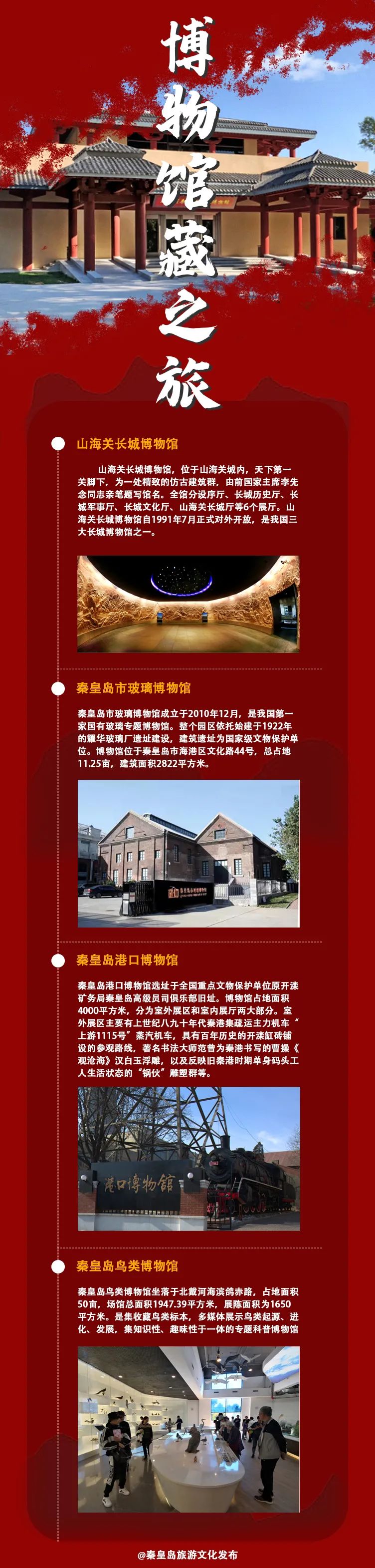 我市历史底蕴深厚,文化特色鲜明,市区内分布着众多特色专题博物馆。博物馆藏之旅推荐参观点有山海关长城博物馆、秦皇岛市玻璃博物馆、秦皇岛港口博物馆、秦皇岛鸟类博物馆和昌黎李大钊革命旧址展览馆等。