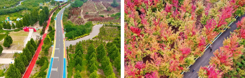 万亩秀林景区栽植白皮松、红枫、流苏、樱花、国槐等各类景观树和精品行道树苗木400余万株。兼顾生态观光、花卉种植、中草药培育等业态,栽植中药材3000亩,海棠、玉兰、射干等花卉3500亩,形成了四季常绿、三季有花的绿化格局。
