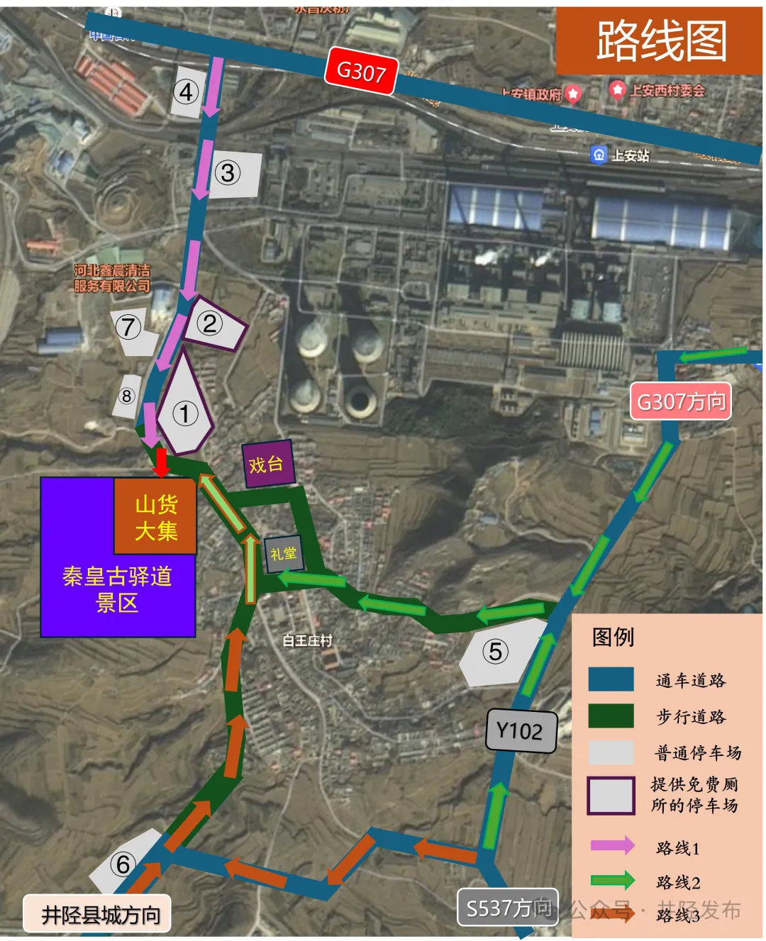 1.石家庄市区—龙泉西路—G307—白王庄村(①、②、③、④、⑦、⑧号停车场)—秦皇古驿道景区