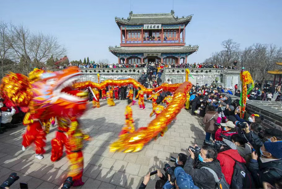 3月1日上午10:00,来自河北易县摆字龙灯、山东临清龙灯扛阁、河南焦作孟州市火舞龙、四川双流黄龙溪火龙灯舞、浙江浦江板凳龙等国家级非遗代表性项目队伍;山西阳泉平定移穰龙灯舞等省级非遗代表性项目队伍;北京通州运河龙灯、天津翔云舞龙、秦皇岛龙狮缘等市级非遗代表性项目队伍伴随着铿锵有力的锣鼓和音乐,在澄海楼下依次展示各具地域特色、艺术风格和文化内涵的龙舞,体现我国舞龙文化的丰富性和多样性,最后在老一辈舞龙非遗代表性传承人和儿童舞龙队的共舞交接仪式中活动达到高潮,全国舞龙大会就此启幕。