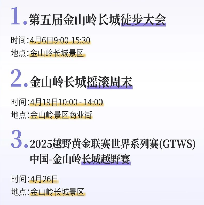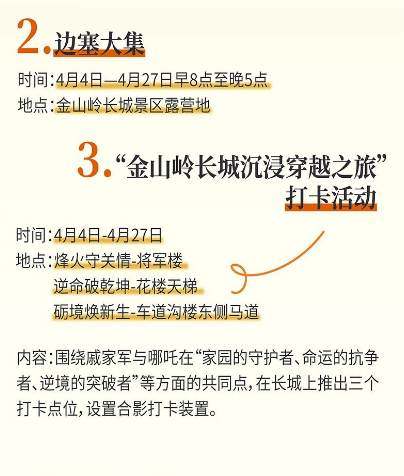 第五届金山岭长城徒步大会将于4月6日激情开跑,本次徒步大会设有10公里半程组别和22公里全程组别,赛事路线沿着金山岭长城蜿蜒前行,让参与者用脚步丈量历史,用行动保护长城。4月19日的金山岭长城摇滚周末将为您带来一场热血沸腾的音乐狂欢,当地知名乐队炸场,涵盖流行摇滚、重金属、朋克等多元风格,演出间隙还将抽取幸运游客获得景区年卡、文创产品等丰厚奖品。