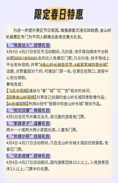 杏花纷飞处,长城候君来。这个春天,与金山岭共赴一场横跨历史与自然的浪漫之约。赏烽火台畔杏雪如海,品边塞集市人间烟火,探长城文化源远流长。