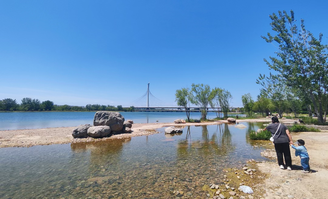 在晓月湖湿地西侧,有一片卵石滩,其北侧为林地。此次提升将滹沱河水巧妙引入蜿蜒的卵石溪流,用木栈道串联起周边林地与场地,形成游览路线,增强了游客的亲水体验。