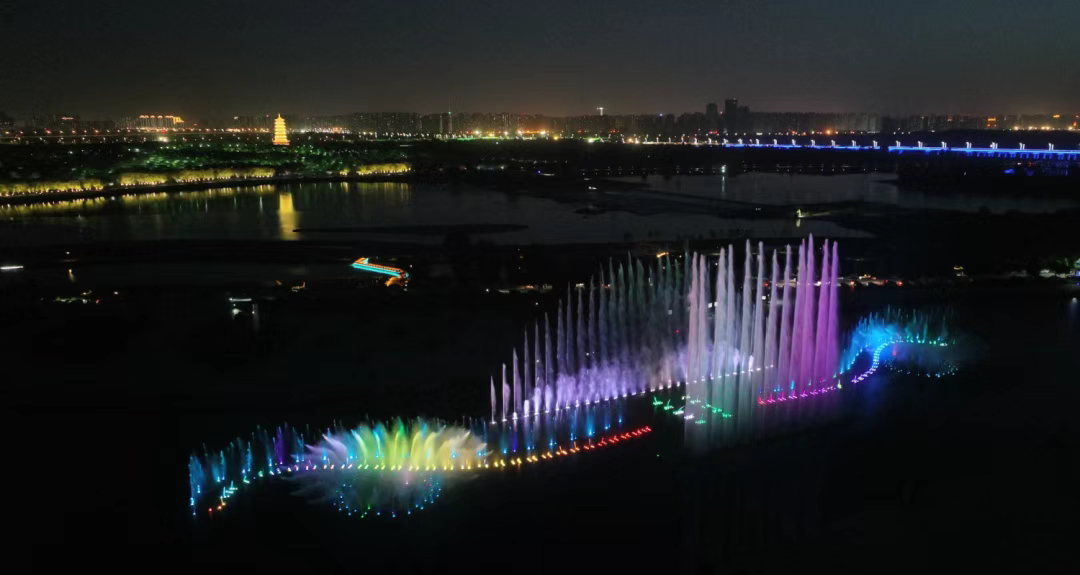 滹沱河生态区“光影水秀”位于石家庄市滹沱河生态区城区段,子龙大桥至新城大街之间的明曦湖公园河湖广场。