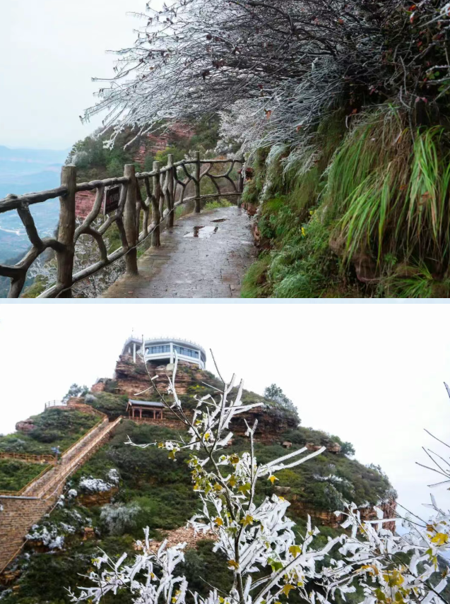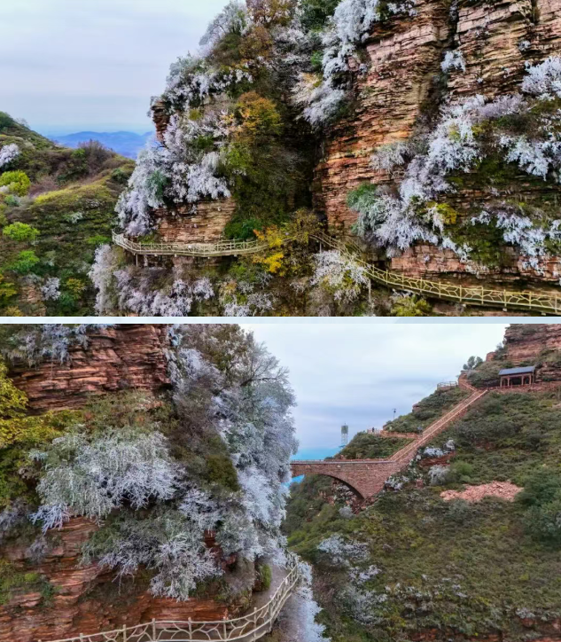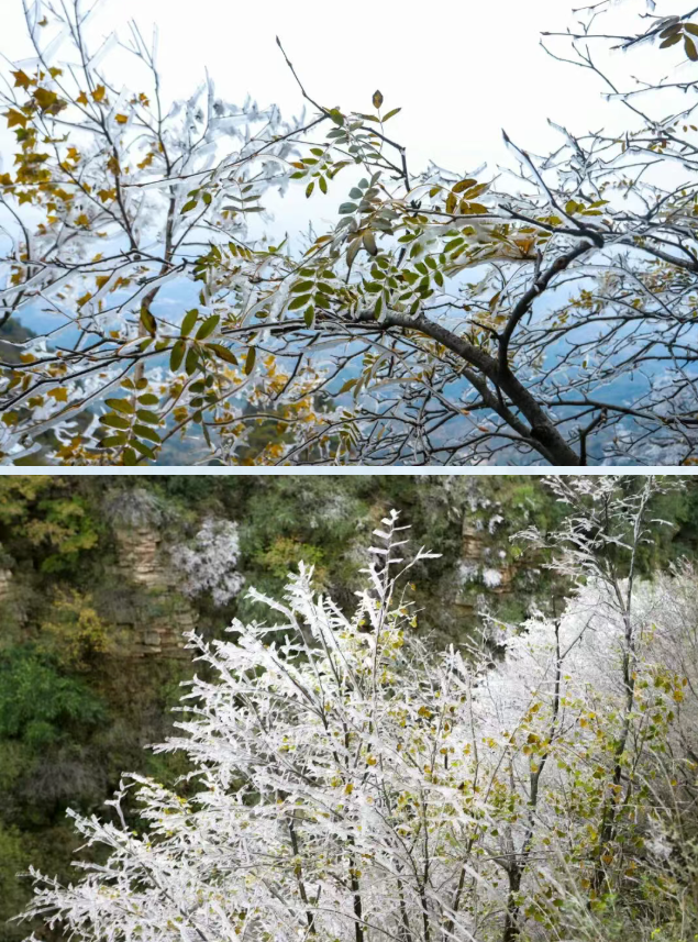 微风拂过 细碎的冰晶簌簌飘落 宛如冬日里洒落的点点星光 浪漫动人 凑近观赏 雾凇的姿态千姿百态,意趣盎然 有的如缀在枝桠间的碎钻 在阳光照射下折射出细碎光芒 有的似裹着薄冰的玉簪 将草木的轮廓勾勒得愈发灵动 还有的轻覆在尚未褪尽的秋黄 深红叶片上 让秋日暖意与冬日清冽在枝头交织相融 别有一番韵味 漫步山间 脚下是落叶轻响 抬头是满目银装 空气中弥漫着冰晶的清新气息 仿佛置身于一幅静谧雅致的冬日画卷之中 雾凇 又称树挂、傲霜花、银花、雪柳等 是大自然赠予武安的限定礼物 它不似白雪那般厚重 却比白雪更显精致 每一片冰晶都藏着低温与水汽的默契 每一处银装都诉说着时节交替的私语 无需刻意寻觅 只需踏入西部山区 这份美好便可能在蜿蜒山径旁 层叠林木间与你不期而遇 眼下的武安 正以雾凇为笺 写着初冬的邀约 趁着多云间晴的好天气 不妨约上三五好友 裹上温暖衣物 走进古武当山 赴这场雾凇盛宴 毕竟 这般藏于时节缝隙中的自然景致转瞬即逝 如此不期而遇的美好 一年里也难得邂逅几回