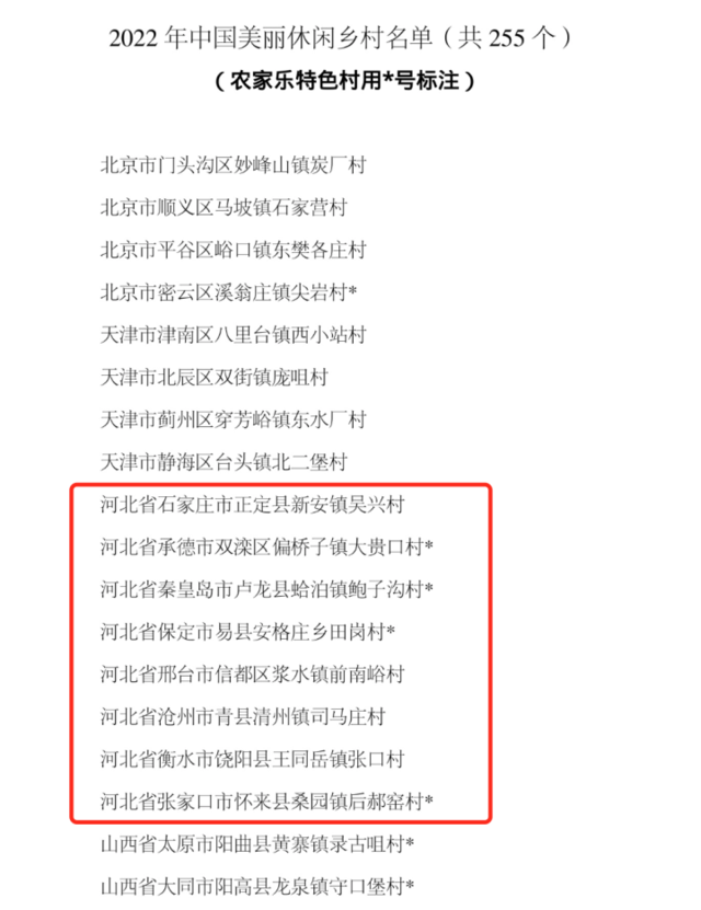 据农业农村部网站消息,农业农村部办公厅公布了2022年中国美丽休闲乡村名单,经各省遴选推荐、专家评审和网上公示,推介北京市门头沟区妙峰山镇炭厂村等255个乡村为2022年中国美丽休闲乡村,其中农家乐特色村84家(农家乐特色村用*号标注)。河北省石家庄市正定县新安镇吴兴村、河北省承德市双滦区偏桥子镇大贵口村*、河北省秦皇岛市卢龙县蛤泊镇鲍子沟村*、河北省保定市易县安格庄乡田岗村*、河北省邢台市信都区浆水镇前南峪村、河北省沧州市青县清州镇司马庄村、河北省衡水市饶阳县王同岳镇张口村和河北省张家口市怀来县桑园镇后郝窑村*入选2022年中国美丽休闲乡村名单。