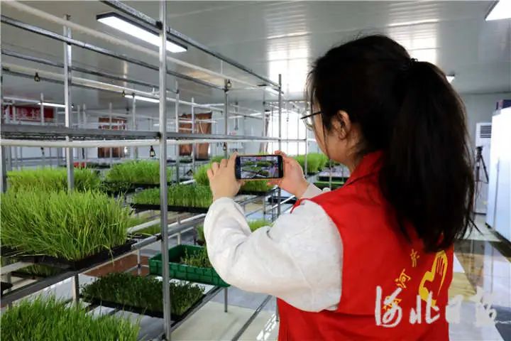 在调河头镇南郭庄村,鑫目农业合作社的芽苗菜无土栽培温室内,镇助农小分队正在拍摄产品宣传视频素材。通讯员高语婧摄