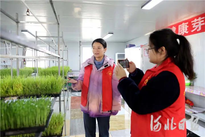 在调河头镇南郭庄村,鑫目农业合作社的芽苗菜无土栽培温室内,镇助农小分队正在和农户交流产品宣传视频拍摄细节。通讯员高语婧摄