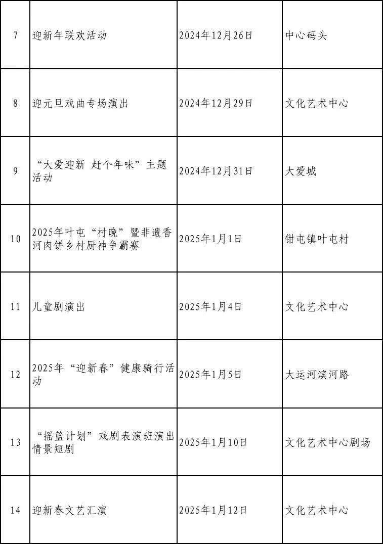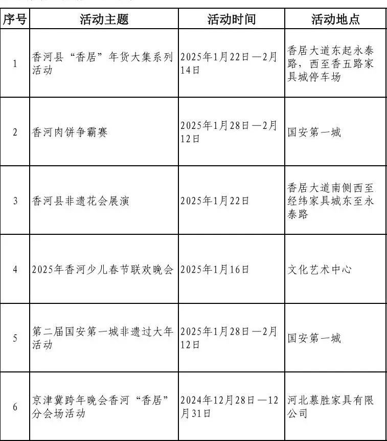 2025年是“十四五”规划的收官一年。为充分展示我县经济社会发展成果,满足广大群众的精神文化需求,营造喜庆祥和的节日氛围,我县在元旦、春节期间推出了一系列富有香河特色的文化活动,让广大人民群众乐享“文化盛宴”。