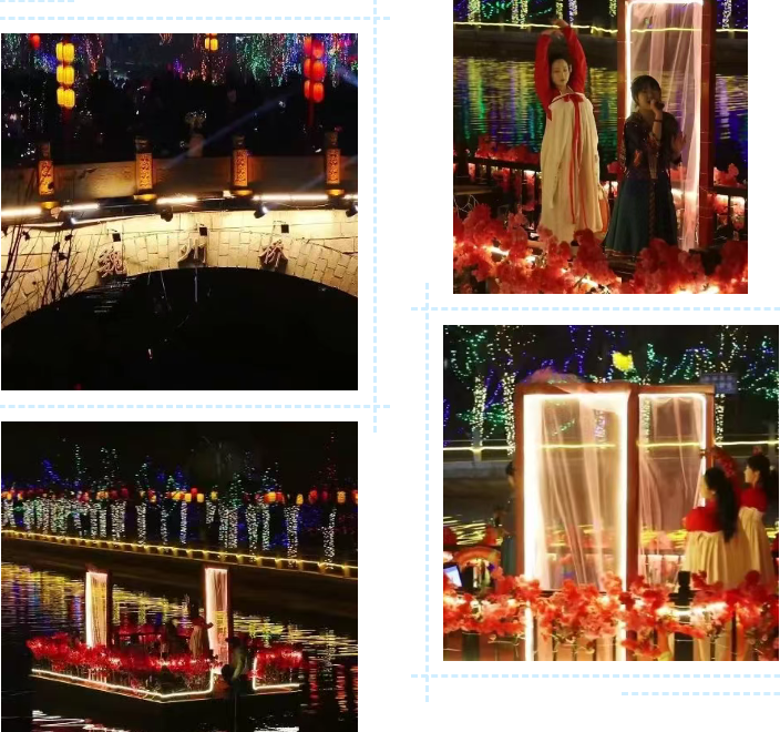 时间到了晚上,在花灯的映照下,即使是晚上的湖面也依旧看着波光粼粼,好似无数细碎的宝石在水面闪烁,画船宛如从古老画卷中驶来的精灵,轻轻飘荡在湖面。 画船本身就是一件艺术品,与身穿古装的表演者结合在一起时,便是今晚这条河上最美的画面。 在此次礼遇魏县元宵节系列活动中,将传统文化和现代潮流交织在一起,为全县人民和广大慕名而来的人们提供了一场视觉与听觉的双重盛宴。