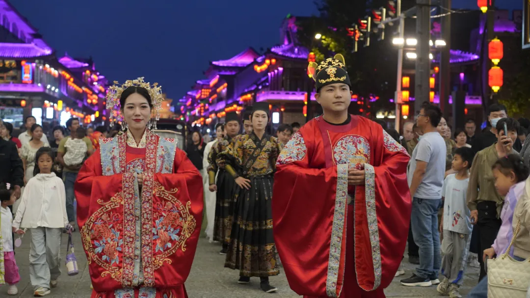 5月26日,暮色渐浓,华灯初上,清风楼府前南街化作一幅流动的古韵画卷。一场别开生面的汉服婚俗表演惊艳亮相,吸引了众多市民和游客驻足观赏。