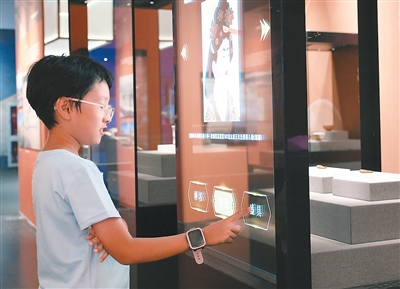 一名小朋友在“长安二千三百里——雄安古州城遗址考古成果展”现场体验文物智能展柜。新华社记者 李 贺摄