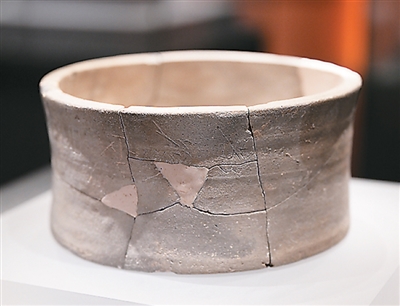 “长安二千三百里——雄安古州城遗址考古成果展”展出的陶量。新华社记者 李 贺摄