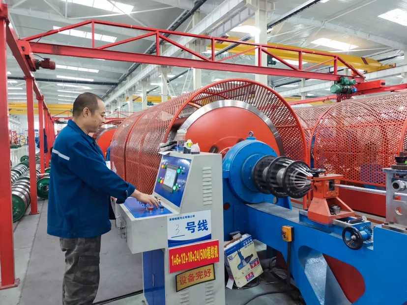 位于宁晋县贾家口镇高端智能制造产业园区的泽楷线缆河北有限公司内,工人正在操作框绞机绞丝。朱丽娜摄