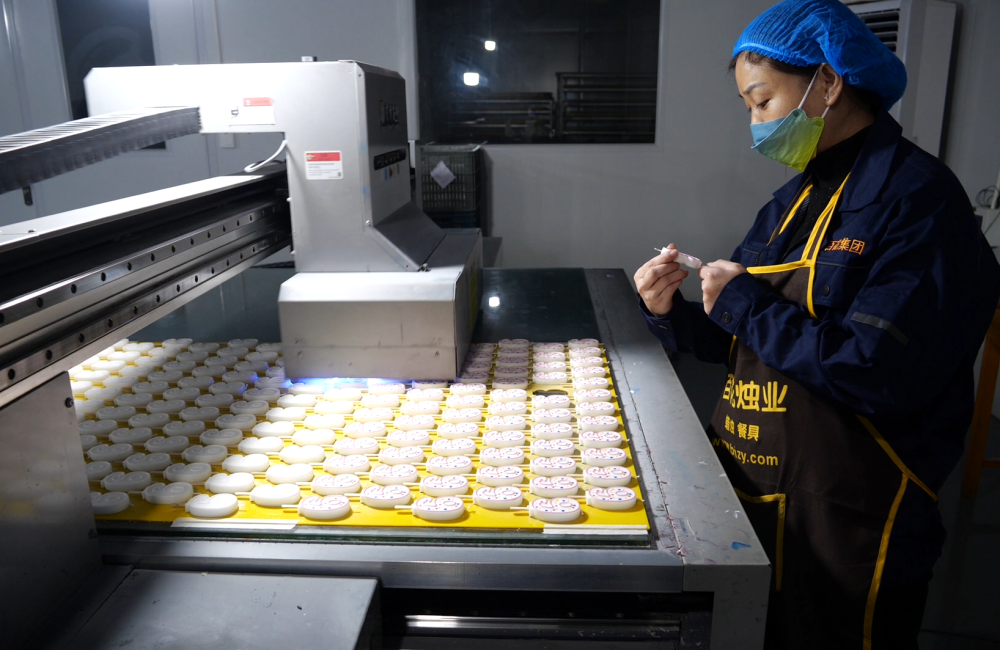 在宁晋县百花烛业有限公司印刷车间内,打印机正在给蜡烛打印上色。新华社记者王晓摄
