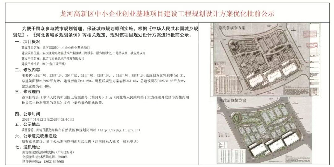 龙河高新区中小企业创业基地项目位于安次区龙河高新技术产业区纵三路以东,横六路以北,总建筑面积302588.86平方米;建设单位是廊坊市宏盛房地产开发有限公司。2025年4月22日至2025年5月1日在安次区龙河高新技术产业区横六路北侧公示,同时在廊坊市自然资源和规划局网站公示,并在廊坊日报刊登公告,公开征询意见。如有意见建议,请于公示期内以书面形式反馈至廊坊市自然资源和规划局,逾期不报,视为放弃上述权利。建设项目位置:安次区龙河高新技术产业区纵三路以东,横六路以北,二号路以西,横五路以南主要优化7#厂房、23#厂房、30#厂房、31#厂房、32#厂房、34#厂房、35#厂房。原规划方案容积率为1.31,总建筑面积243982平方米,建筑密度为44.28%。调整后规划方案容积率1.65,总建筑面积302588.86平方米建筑密度为44.46%。该项目符合《中华人民共和国国土资源部令(第61号)》及《河北省人民政府关于大力推进开发区节约集约用地提高土地利用率的意见》文件中集约节约用地政策。项目现场、廊坊日报及廊坊市自然资源和规划局网站(http://zrghj.lf.gov.cn)如有意见建议,请于公示期内以书面形式反馈(注明联系人姓名,联系电话)